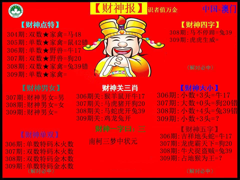309期:澳门六合彩彩圖信封【红财神报】每期自动更新